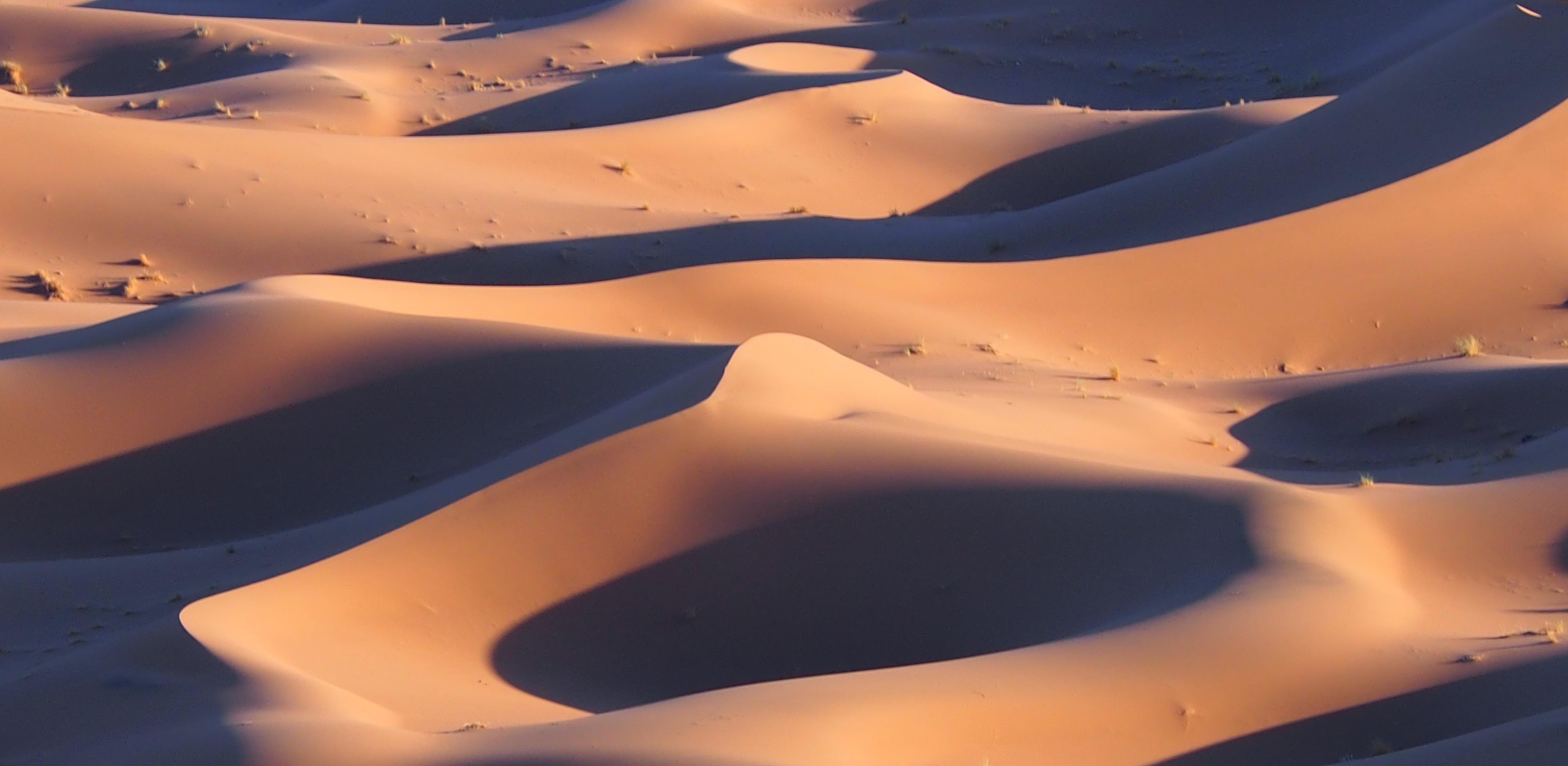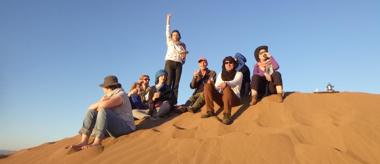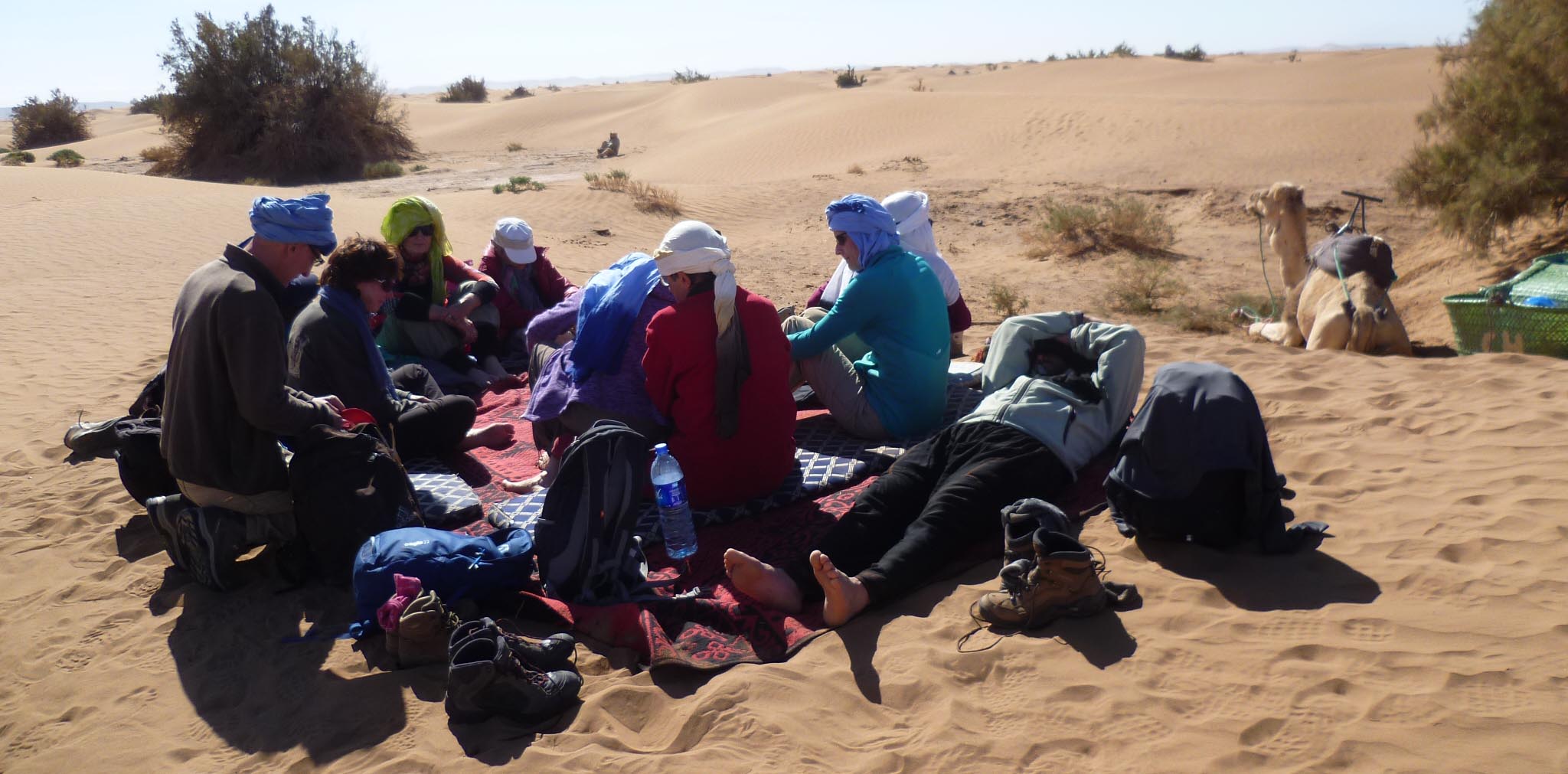 Jour 3, 4, 5 : Proposition de méditation face au soleil levant. Après avoir pris le petit déjeuner et rangé les sacs, nous prenons « la route » en longeant l’oued Draa maintenant asséché. Puis découvrirons les dunes durant 5 jours à travers l’immense plateau désertique de la Hamada du Drâa. L’oued Drâa, véritable frontière naturelle entre le Sahara et l’Atlas, nous offre un univers fascinant, que nous découvrons à pied, avec nos compagnons chameliers. 5 heures de marche par jour à un rythme acceptable qui respecte chacun. Les sacs sont portés par les chameaux de campement en campement. Devançant parfois la caravane ou nous en éloignant de temps à autre, nous la retrouverons tous les midis pour prendre le déjeuner à l’ombre des tamaris. Nous apprécierons les changements de décor entre sable et cailloux ou paysage lunaire. Les temps de marche en silence, propice à un retour sur soi, permettront de s’interroger sur sa quête personnelle, ses questions du moment. Chaque soir un temps de relecture de notre journée nous permettra d’exprimer les moments forts personnellement et d’apprendre à mieux se connaître en profondeur. En fin de journée, nous retrouverons le bivouac installé par les chameliers. Quelques heures de repos nous permettront de nous ressourcer dans le silence au coucher du soleil. A la suite de quoi nous nous retrouvons pour le repas, le temps de partage ou de travail relationnel. Les soirées seront bien occupées, feu de camps, musique, jeux, cuisson du pain et possibilité de dormir à la belle étoile si vous le désirez. Mais dans tous les cas, nous contemplerons l’immensité du ciel étoilé. Nous ferons une boucle passant par le point culminant : la grande colline de sable, de Chegagga. Un moment marquant où nous contemplerons ce magnifique paysage. Ce circuit a l’avantage de nous immerger très rapidement dans les plus beaux massifs dunaires du sud marocain.